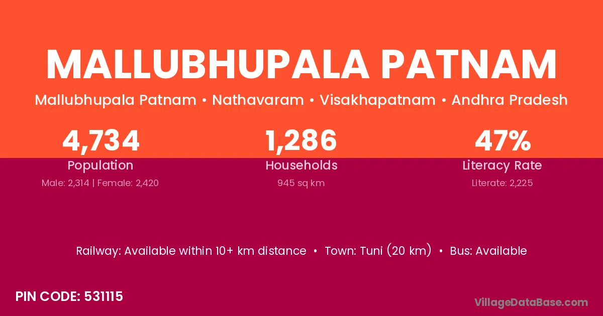 Tuni (20 km) is the nearest town to Mallubhupala Patnam village for major economic activities and is located approximately 20 km away.