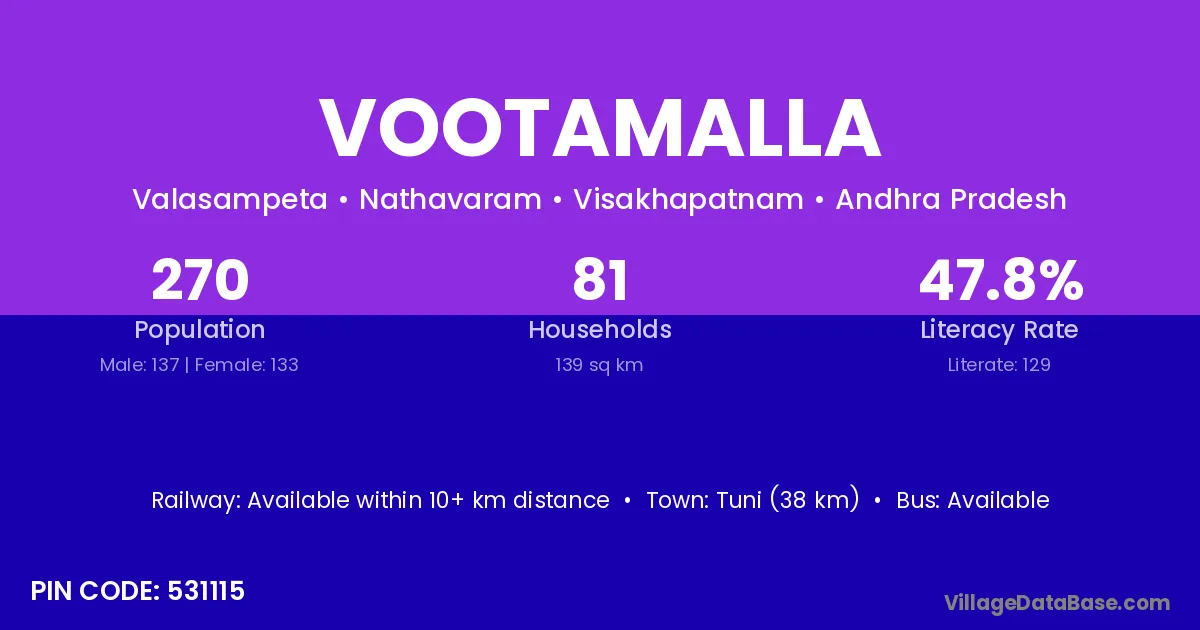 Vootamalla village has a total population of 270 people, of which 137 are males and 133 are females.