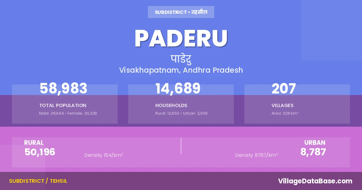 According to the 2011 census The total area of Paderu Mandal is 328 km², with a population of 58983 people. The population density is 180 inhabitants per square kilometre, and there are approximately 14689 houses in the sub district.