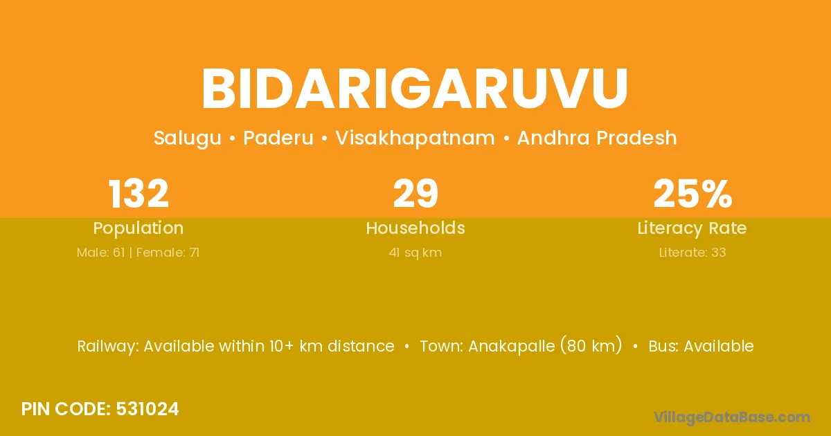 Bidarigaruvu village has a total population of 132 people, of which 61 are males and 71 are females.