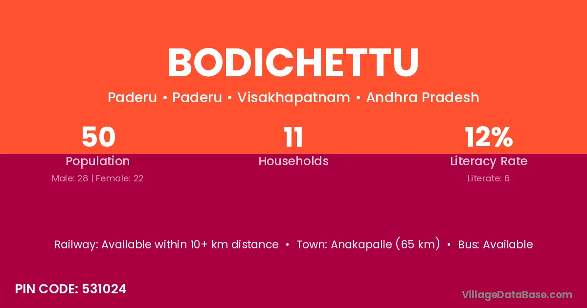 Anakapalle (65 km) is the nearest town to Bodichettu village for major economic activities and is located approximately 65 km away.