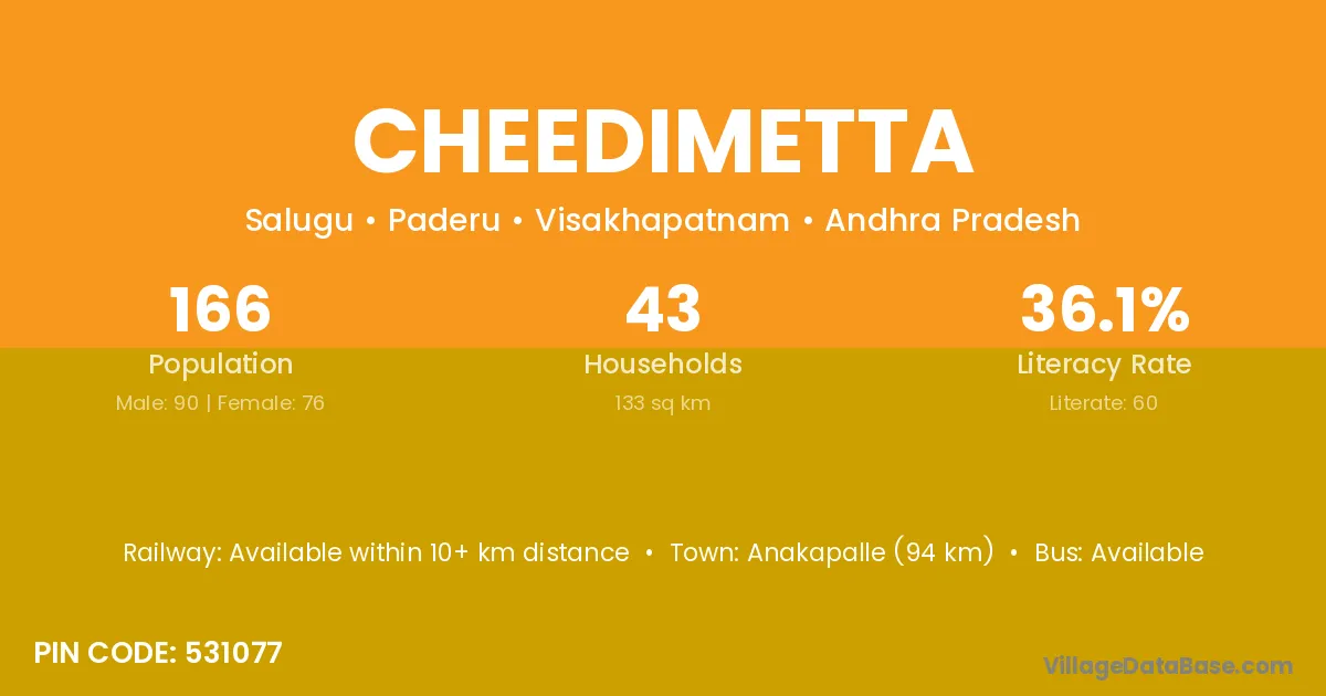 Anakapalle (94 km) is the nearest town to Cheedimetta village for major economic activities and is located approximately 94 km away.