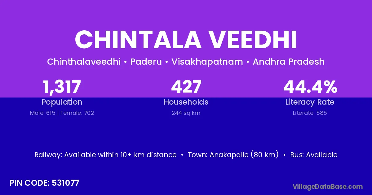 Anakapalle (80 km) is the nearest town to Chintala Veedhi village for major economic activities and is located approximately 80 km away.