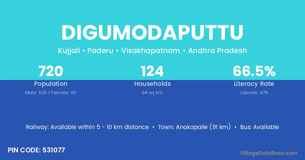 Anakapalle (91 km) is the nearest town to Digumodaputtu village for major economic activities and is located approximately 91 km away.