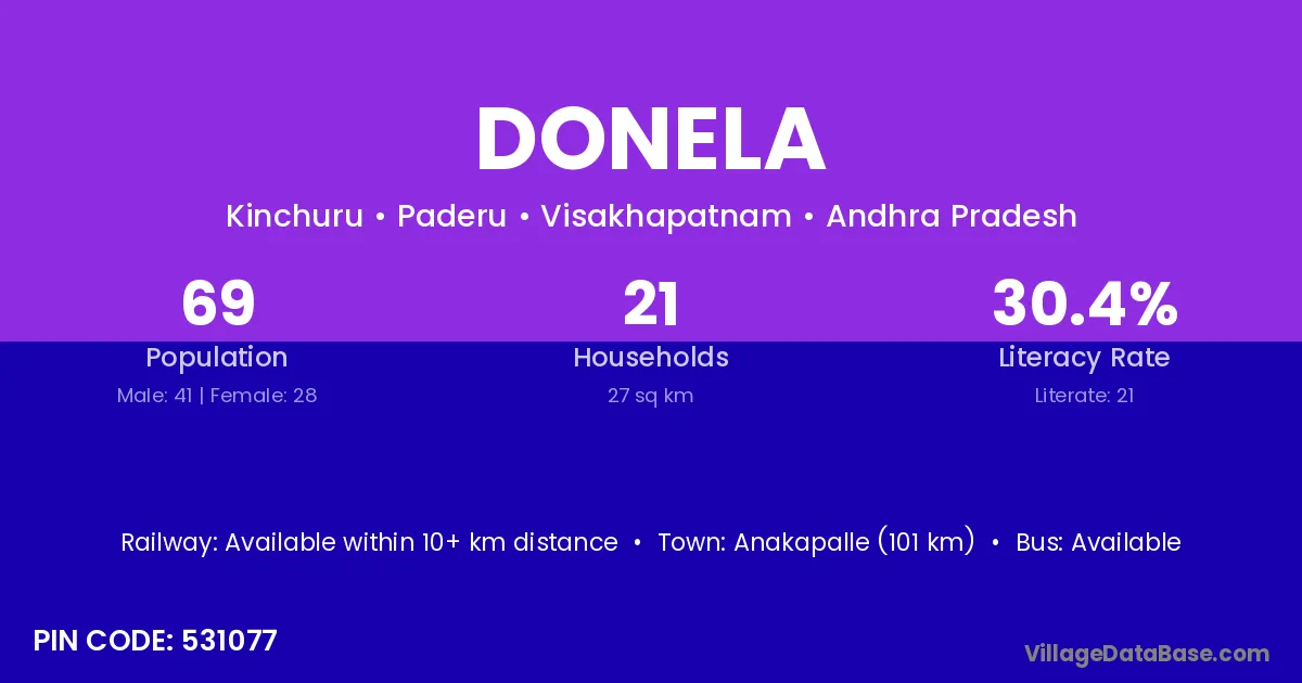 Anakapalle (101 km) is the nearest town to Donela village for major economic activities and is located approximately 101 km away.