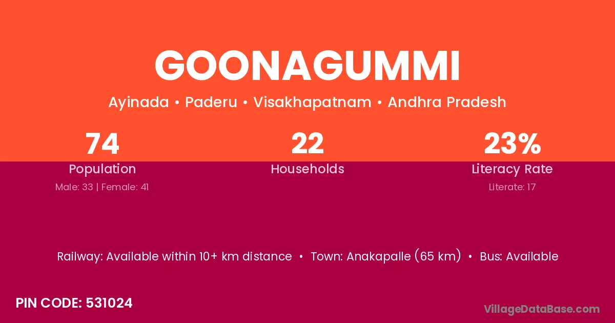 Goonagummi village has a total population of 74 people, of which 33 are males and 41 are females.