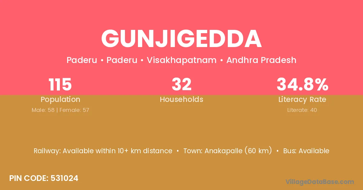Gunjigedda village has a total population of 115 people, of which 58 are males and 57 are females.