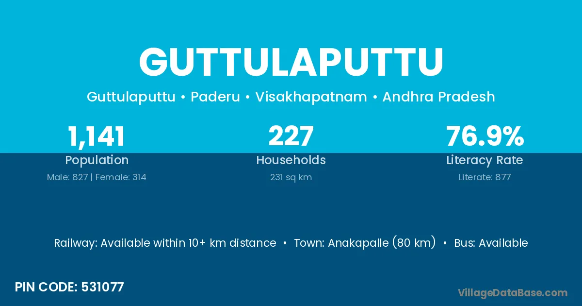 Anakapalle (80 km) is the nearest town to Guttulaputtu village for major economic activities and is located approximately 80 km away.