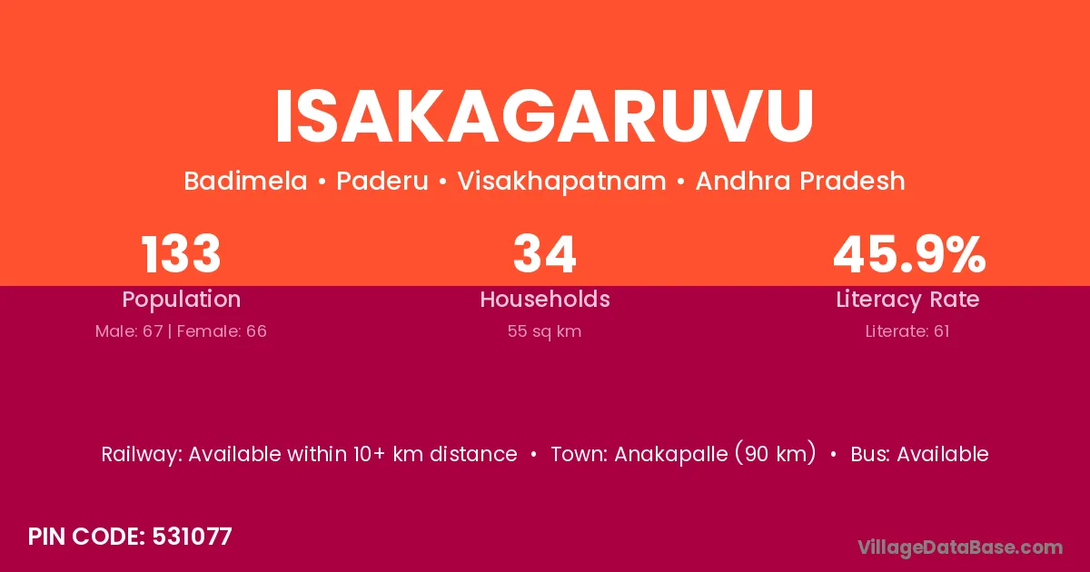 Isakagaruvu village has a total population of 133 people, of which 67 are males and 66 are females.
