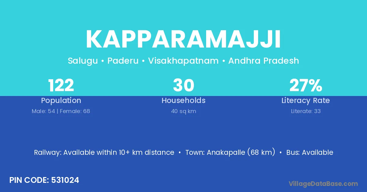 Anakapalle (68 km) is the nearest town to Kapparamajji village for major economic activities and is located approximately 68 km away.