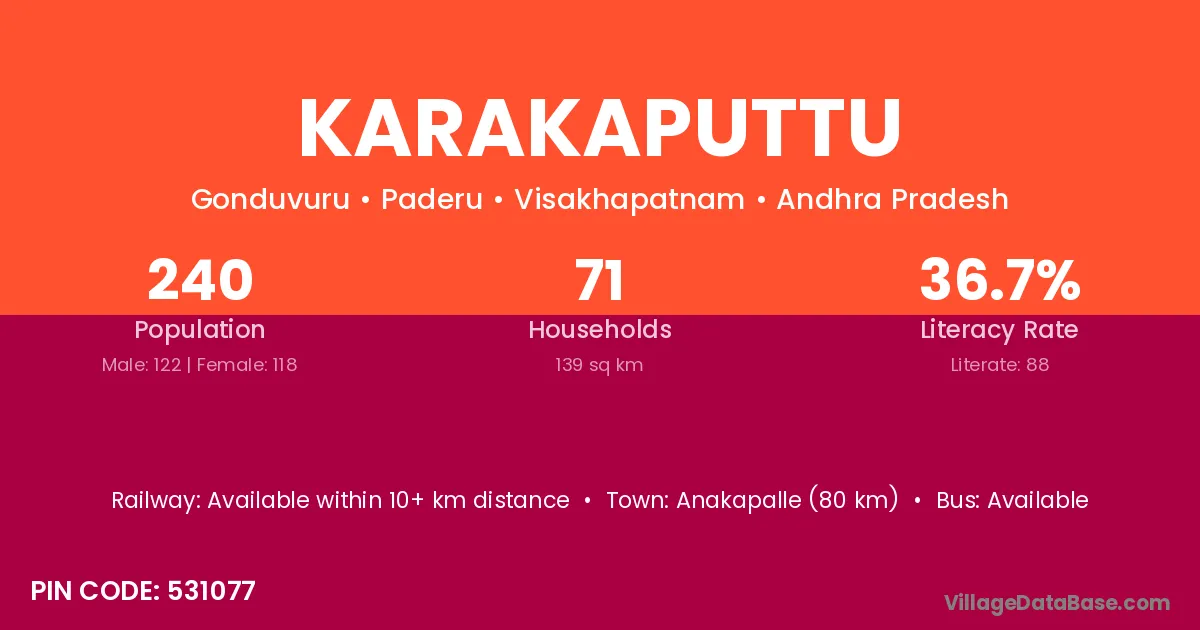 Anakapalle (80 km) is the nearest town to Karakaputtu village for major economic activities and is located approximately 80 km away.