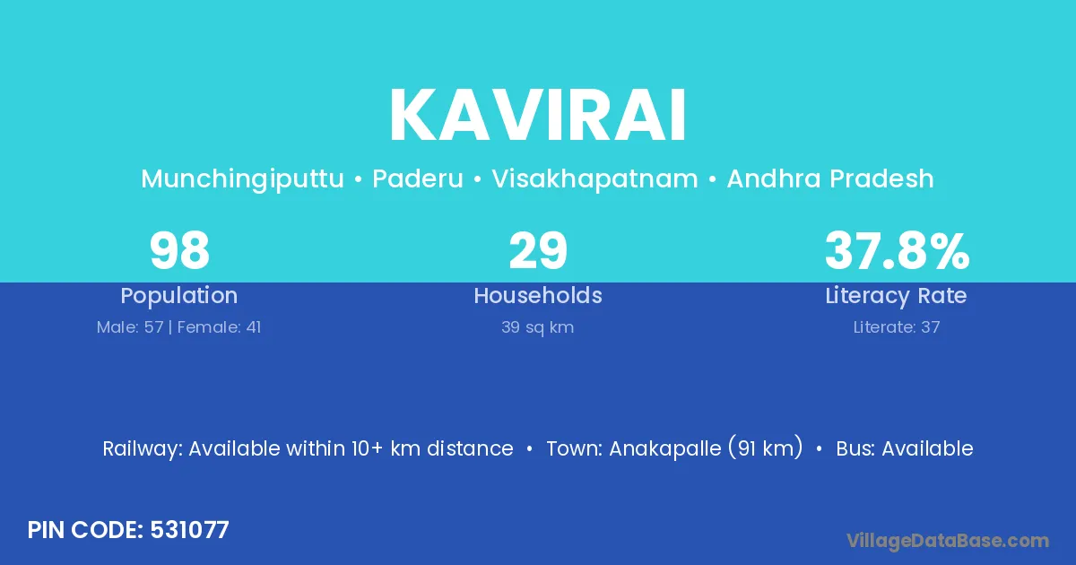 Anakapalle (91 km) is the nearest town to Kavirai village for major economic activities and is located approximately 91 km away.