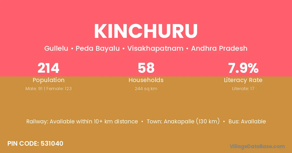 Anakapalle (98 km) is the nearest town to Kinchuru village for major economic activities and is located approximately 98 km away.