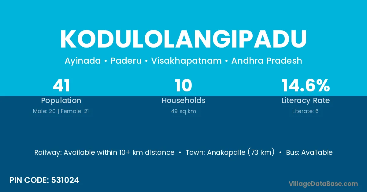 Kodulolangipadu village has a total population of 41 people, of which 20 are males and 21 are females.