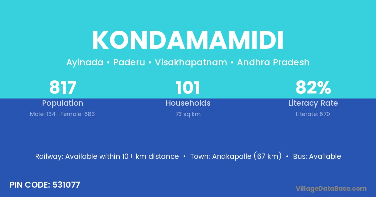 Anakapalle (67 km) is the nearest town to Kondamamidi village for major economic activities and is located approximately 67 km away.