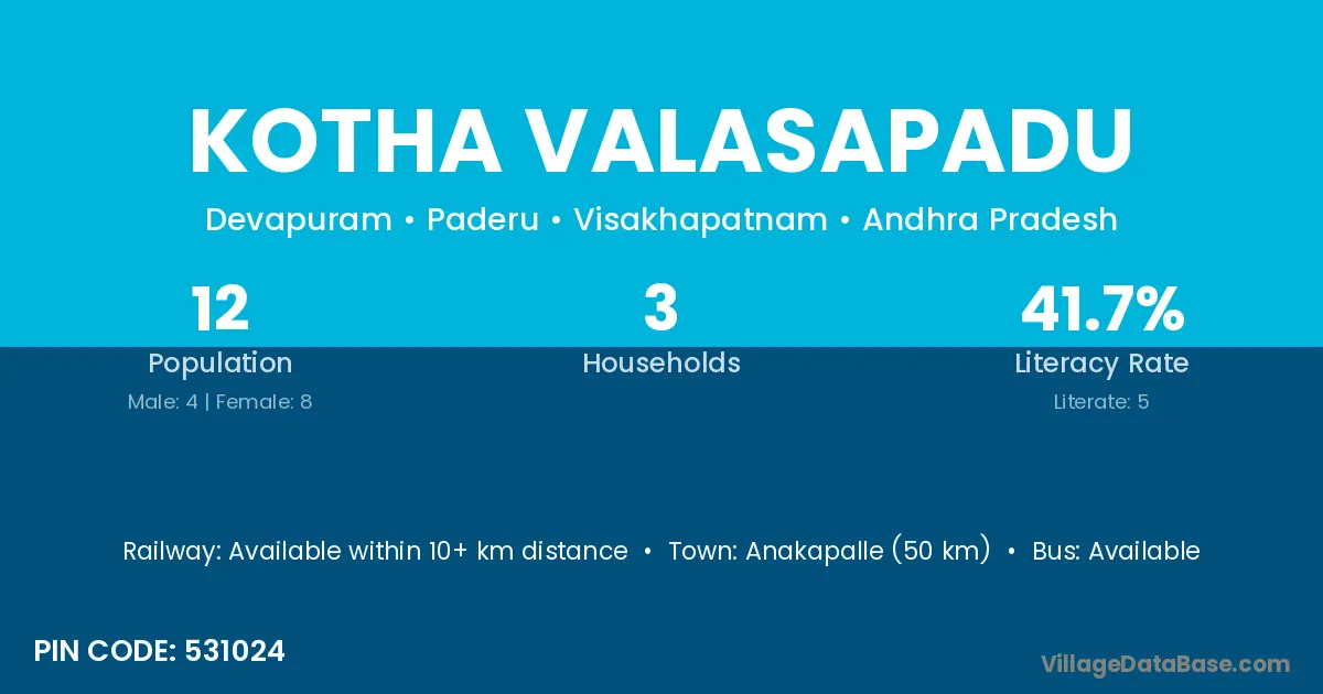 Kotha Valasapadu village has a total population of 12 people, of which 4 are males and 8 are females.