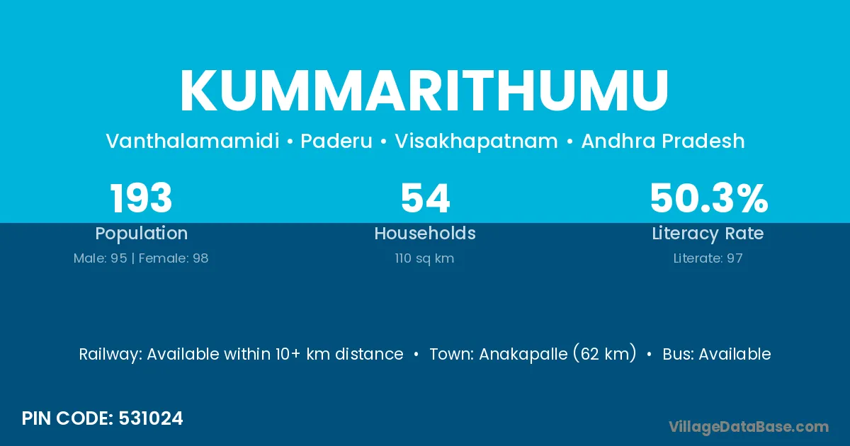 Anakapalle (62 km) is the nearest town to Kummarithumu village for major economic activities and is located approximately 62 km away.