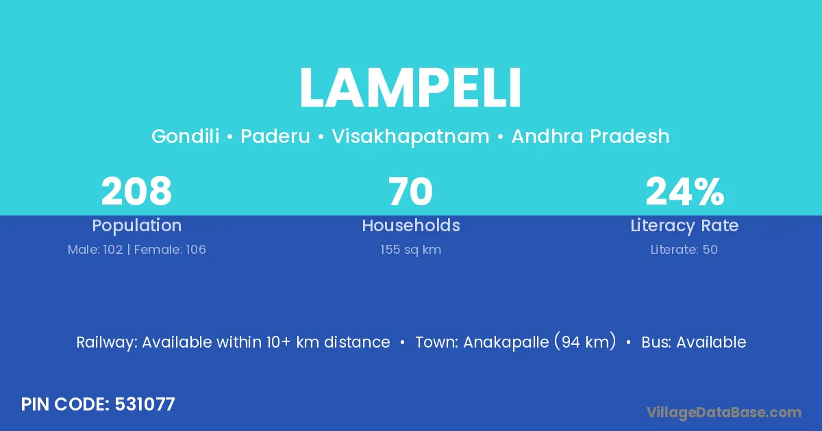 Anakapalle (94 km) is the nearest town to Lampeli village for major economic activities and is located approximately 94 km away.