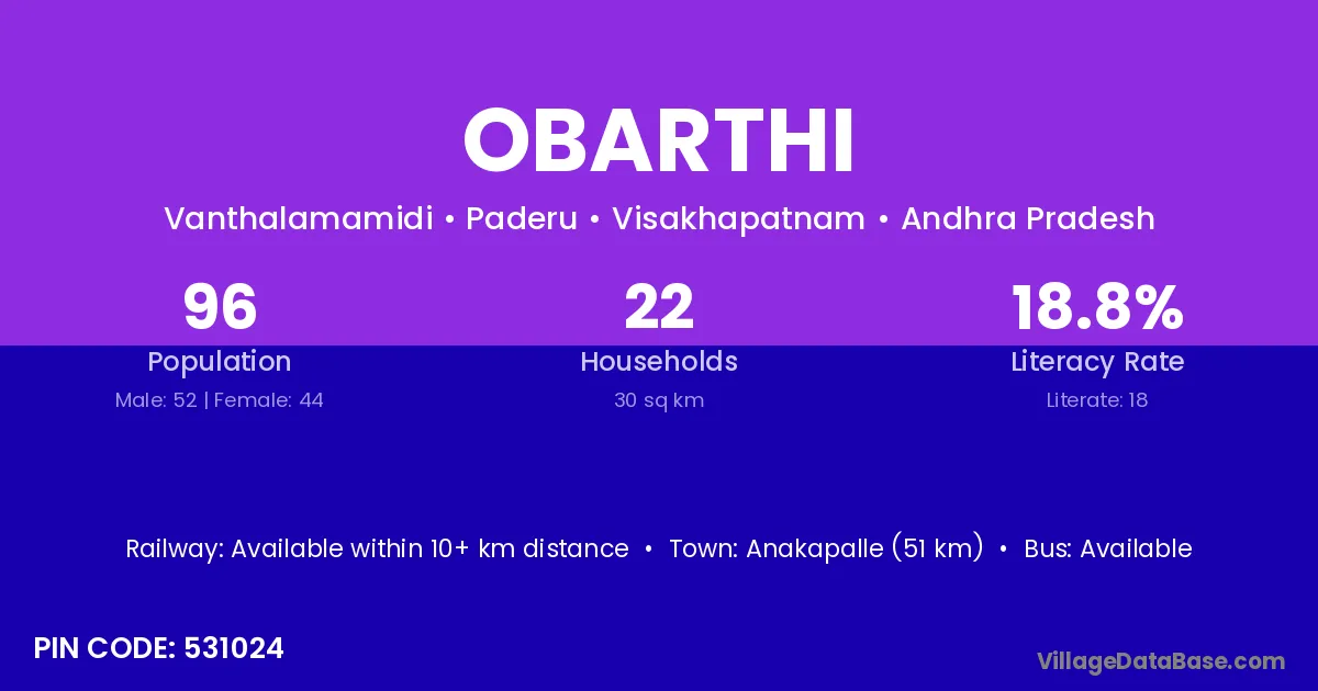 Anakapalle (51 km) is the nearest town to Obarthi village for major economic activities and is located approximately 51 km away.