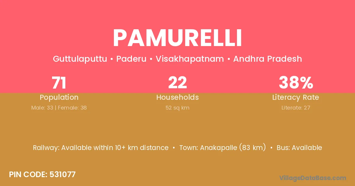 Anakapalle (83 km) is the nearest town to Pamurelli village for major economic activities and is located approximately 83 km away.