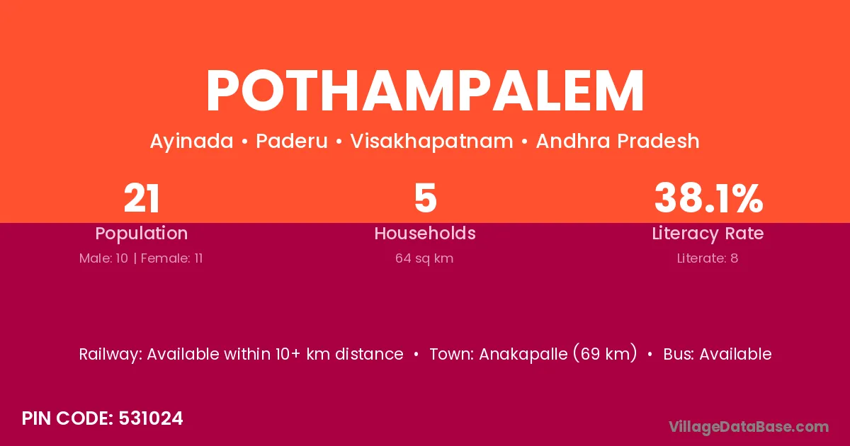 Pothampalem village has a total population of 21 people, of which 10 are males and 11 are females.