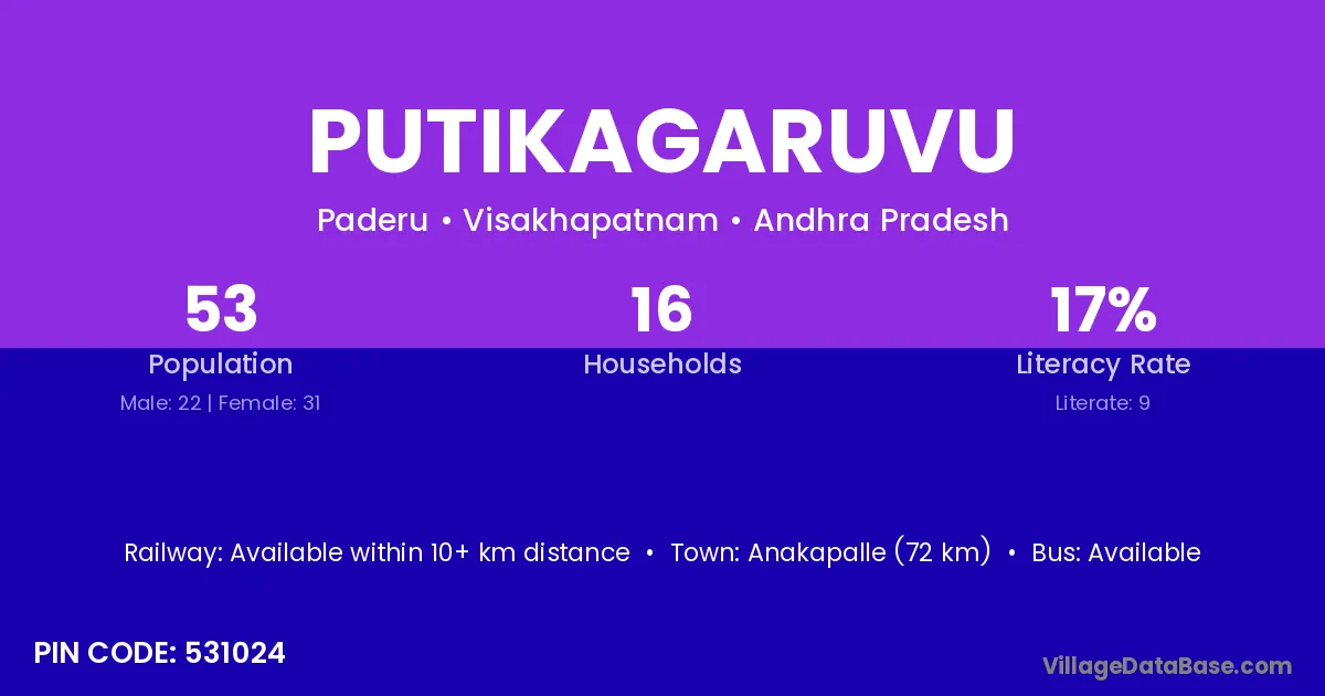 Putikagaruvu village has a total population of 53 people, of which 22 are males and 31 are females.