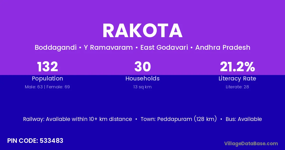Anakapalle (65 km) is the nearest town to Rakota village for major economic activities and is located approximately 65 km away.