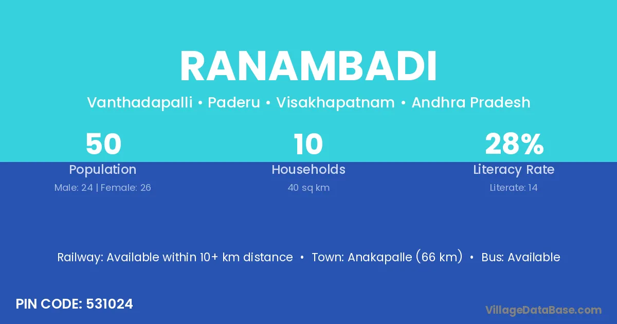 Anakapalle (66 km) is the nearest town to Ranambadi village for major economic activities and is located approximately 66 km away.