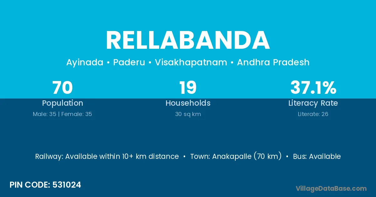Anakapalle (70 km) is the nearest town to Rellabanda village for major economic activities and is located approximately 70 km away.