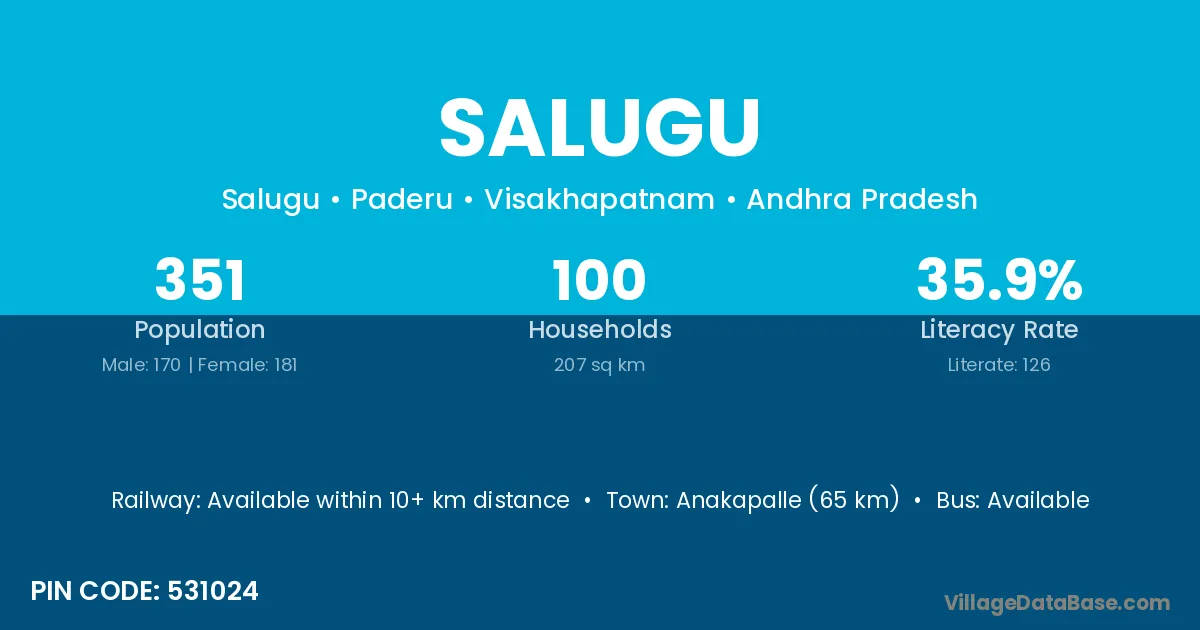 Anakapalle (65 km) is the nearest town to Salugu village for major economic activities and is located approximately 65 km away.