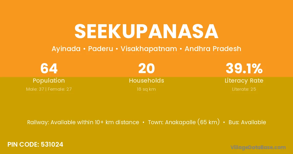 Anakapalle (65 km) is the nearest town to Seekupanasa village for major economic activities and is located approximately 65 km away.