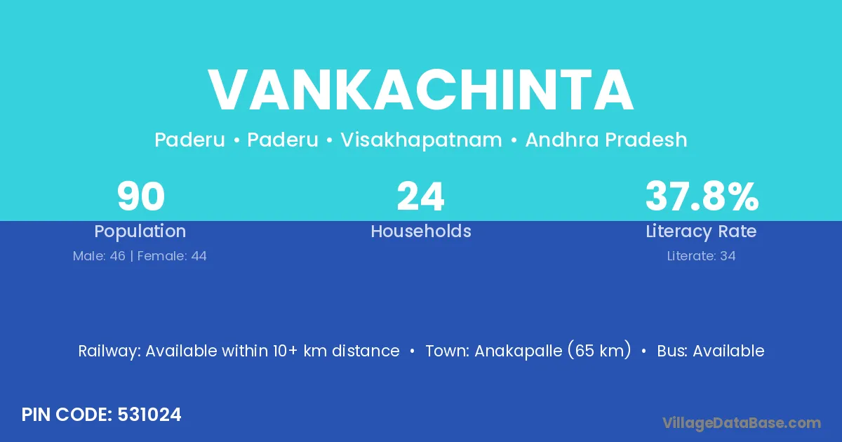 Anakapalle (65 km) is the nearest town to Vankachinta village for major economic activities and is located approximately 65 km away.