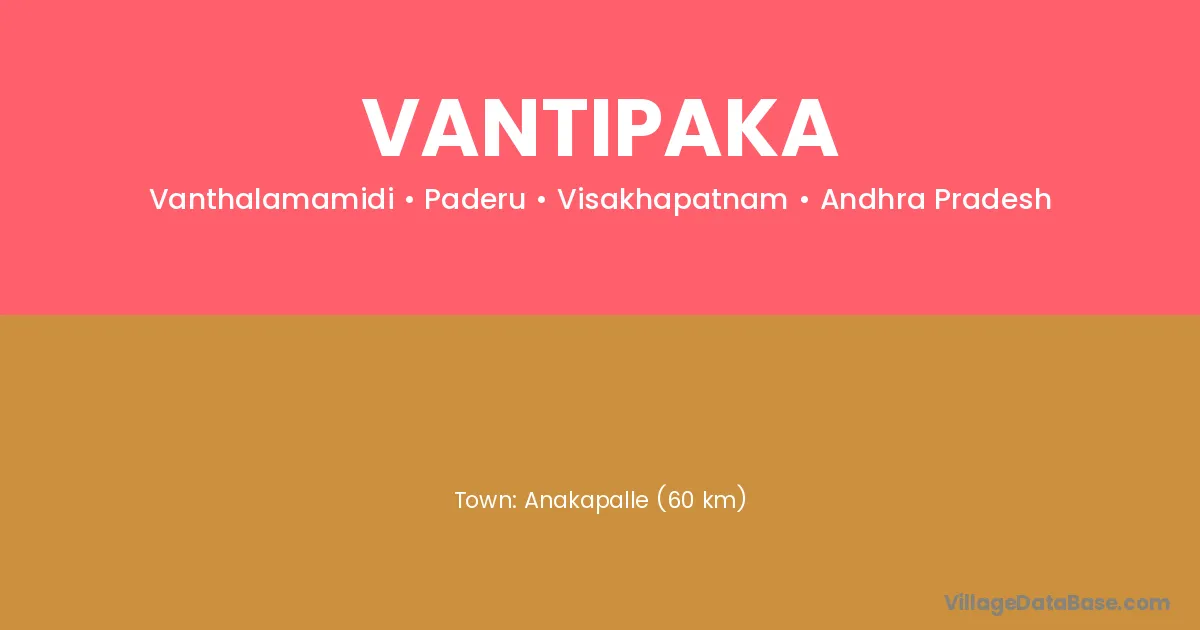 Anakapalle (60 km) is the nearest town to Vantipaka village for major economic activities and is located approximately 60 km away.