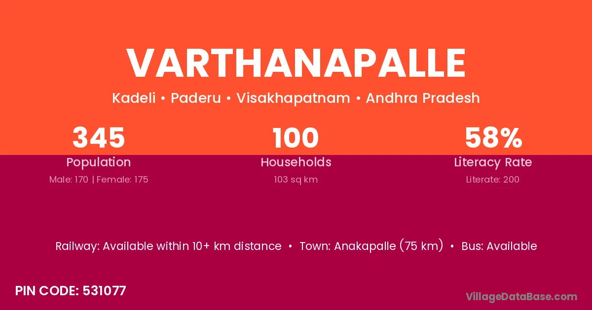 Anakapalle (75 km) is the nearest town to Varthanapalle village for major economic activities and is located approximately 75 km away.