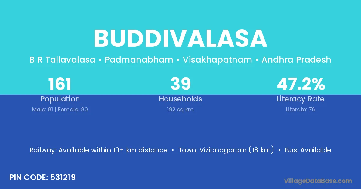 Vizianagaram (18 km) is the nearest town to Buddivalasa village for major economic activities and is located approximately 18 km away.