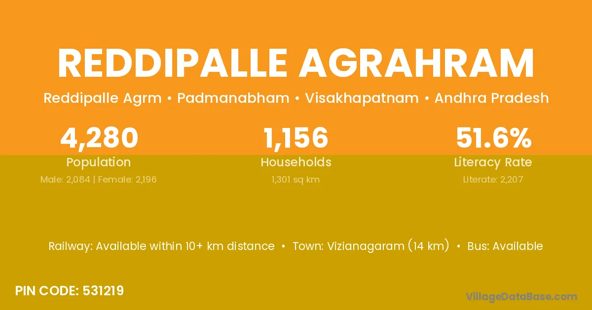 Vizianagaram (14 km) is the nearest town to Reddipalle Agrahram village for major economic activities and is located approximately 14 km away.