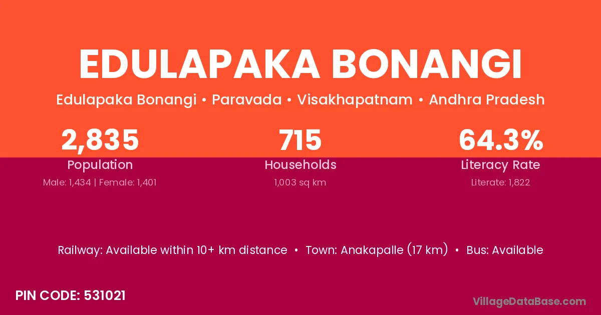 Anakapalle (17 km) is the nearest town to Edulapaka Bonangi village for major economic activities and is located approximately 17 km away.