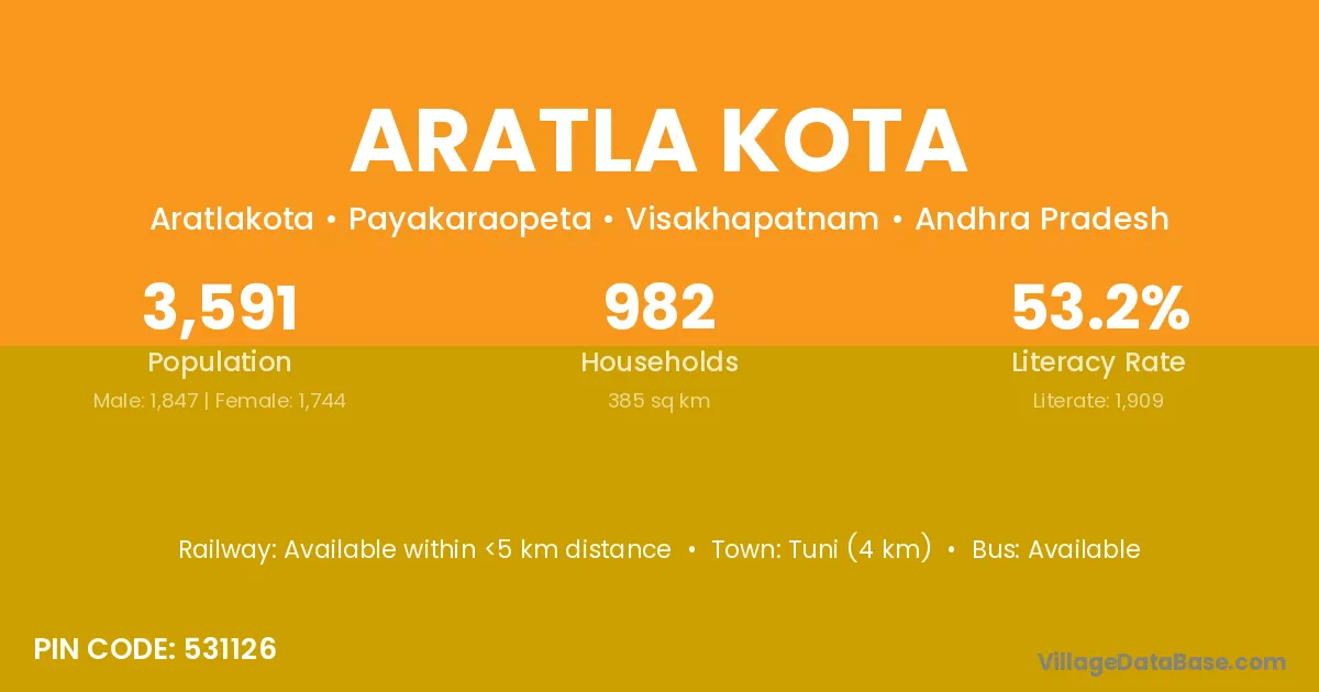 Tuni (4 km) is the nearest town to Aratla Kota village for major economic activities and is located approximately 4 km away.