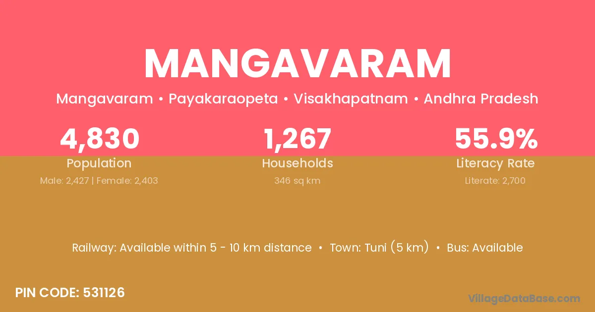 Mangavaram village has a total population of 4,830 people, of which 2,427 are males and 2,403 are females.
