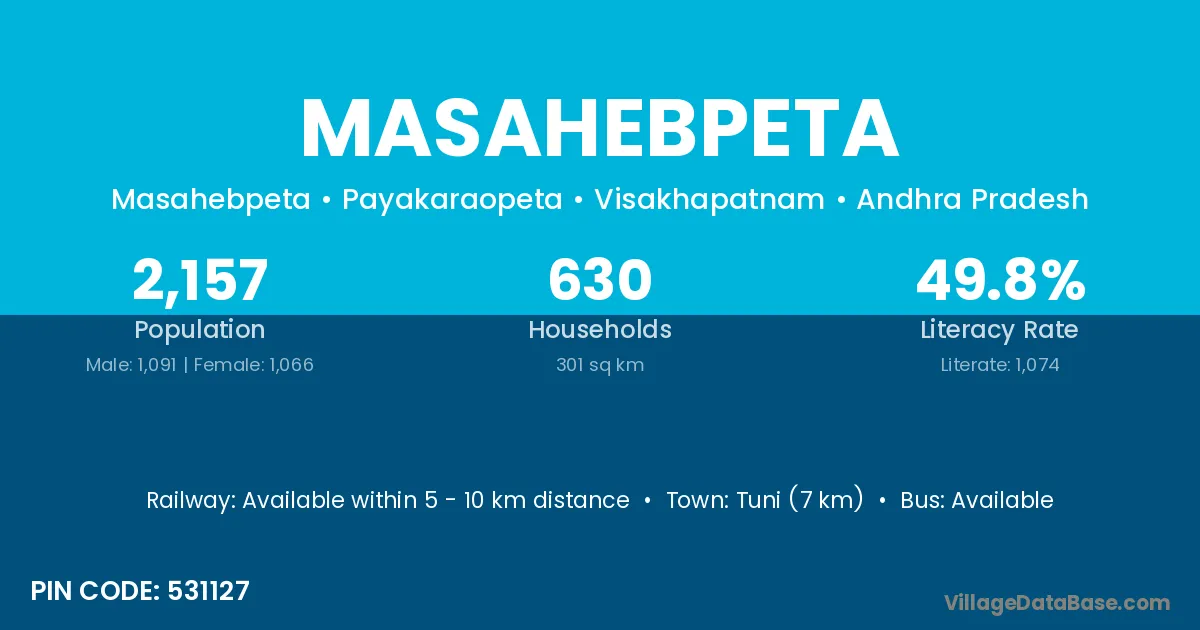Tuni (7 km) is the nearest town to Masahebpeta village for major economic activities and is located approximately 7 km away.