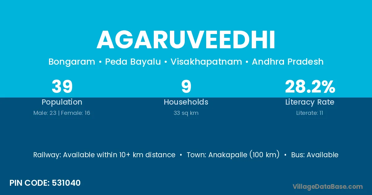 Agaruveedhi village has a total population of 39 people, of which 23 are males and 16 are females.