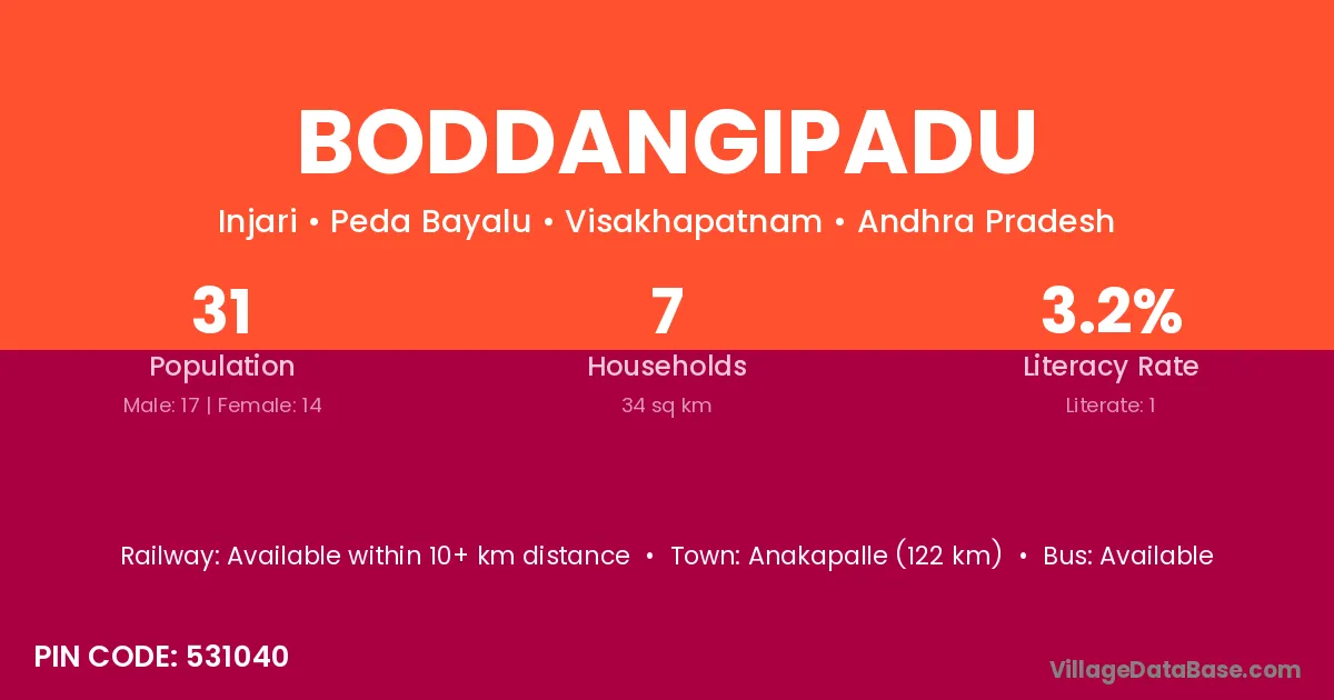 Boddangipadu village has a total population of 31 people, of which 17 are males and 14 are females.