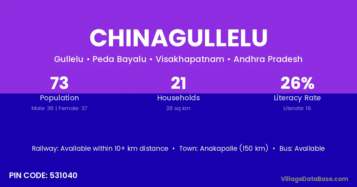 Anakapalle (150 km) is the nearest town to Chinagullelu village for major economic activities and is located approximately 150 km away.