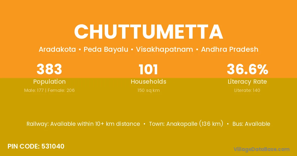 Anakapalle (136 km) is the nearest town to Chuttumetta village for major economic activities and is located approximately 136 km away.
