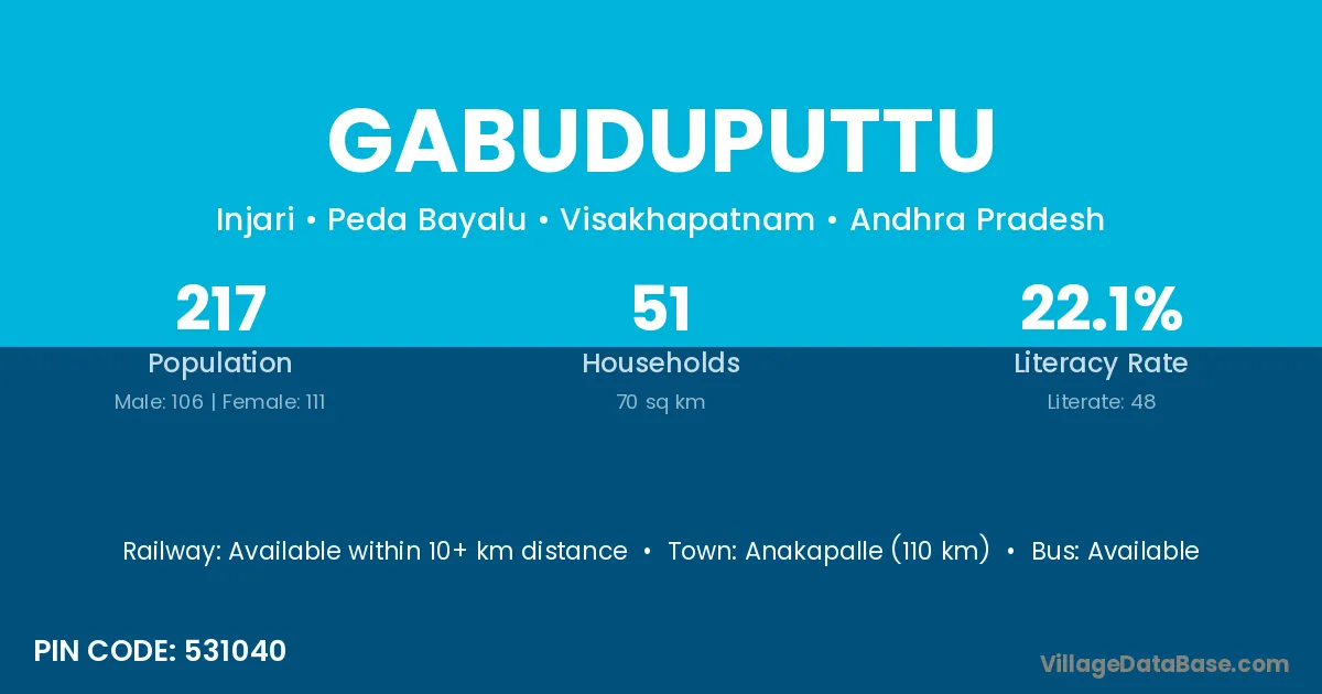 Gabuduputtu village has a total population of 217 people, of which 106 are males and 111 are females.