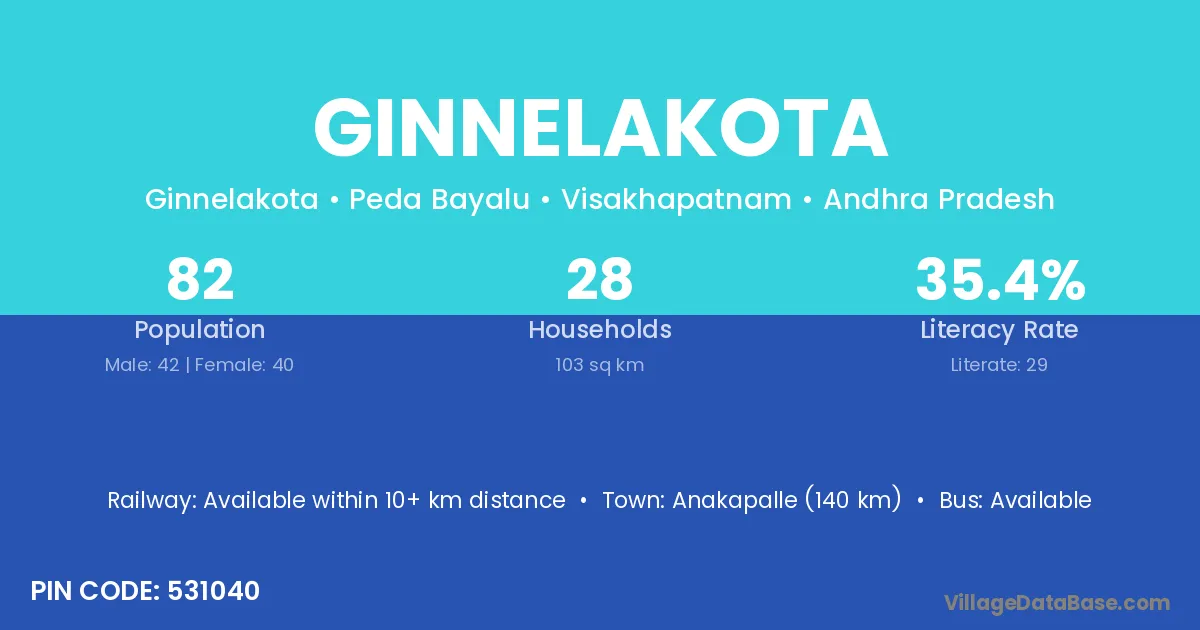 Anakapalle (140 km) is the nearest town to Ginnelakota village for major economic activities and is located approximately 140 km away.