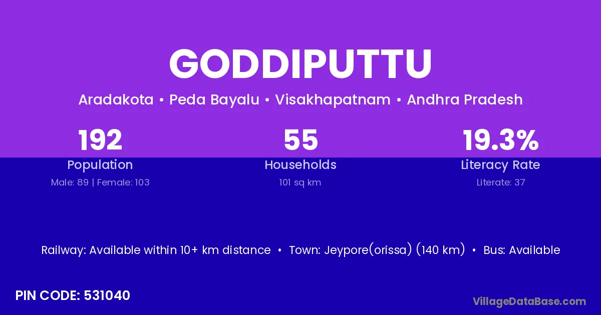Goddiputtu village has a total population of 192 people, of which 89 are males and 103 are females.