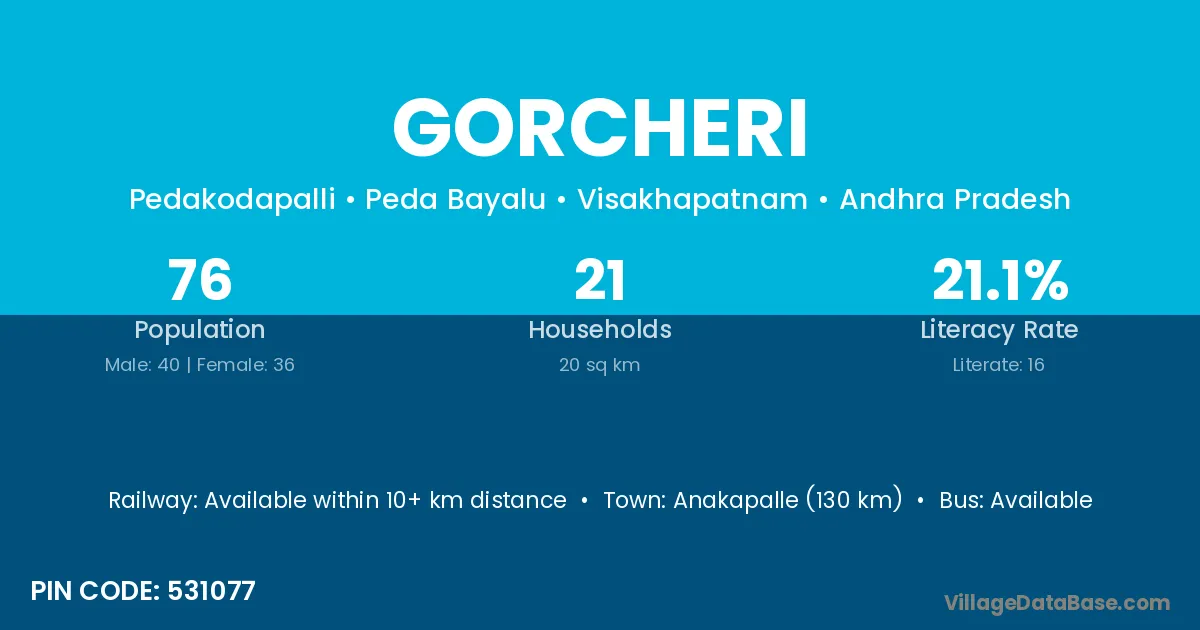 Anakapalle (130 km) is the nearest town to Gorcheri village for major economic activities and is located approximately 130 km away.