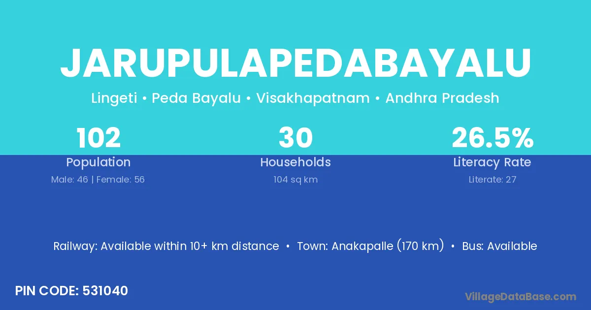 Jarupulapedabayalu village has a total population of 102 people, of which 46 are males and 56 are females.