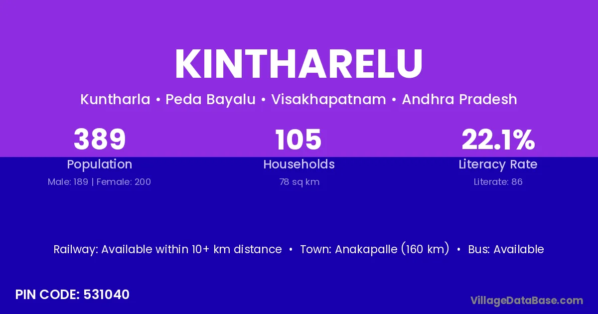 Kintharelu village has a total population of 389 people, of which 189 are males and 200 are females.